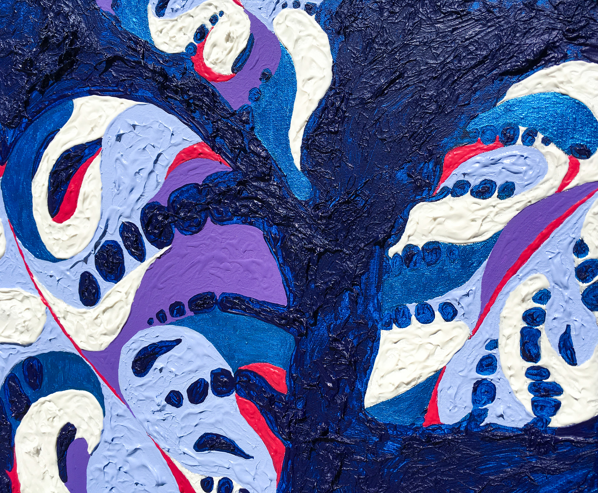 It is amazing how plants similar in structure can appear out of nothing but each absolutely individual, as blue color on this canvas can be both a leaf and grass or the sky.