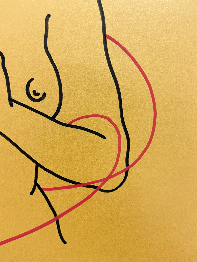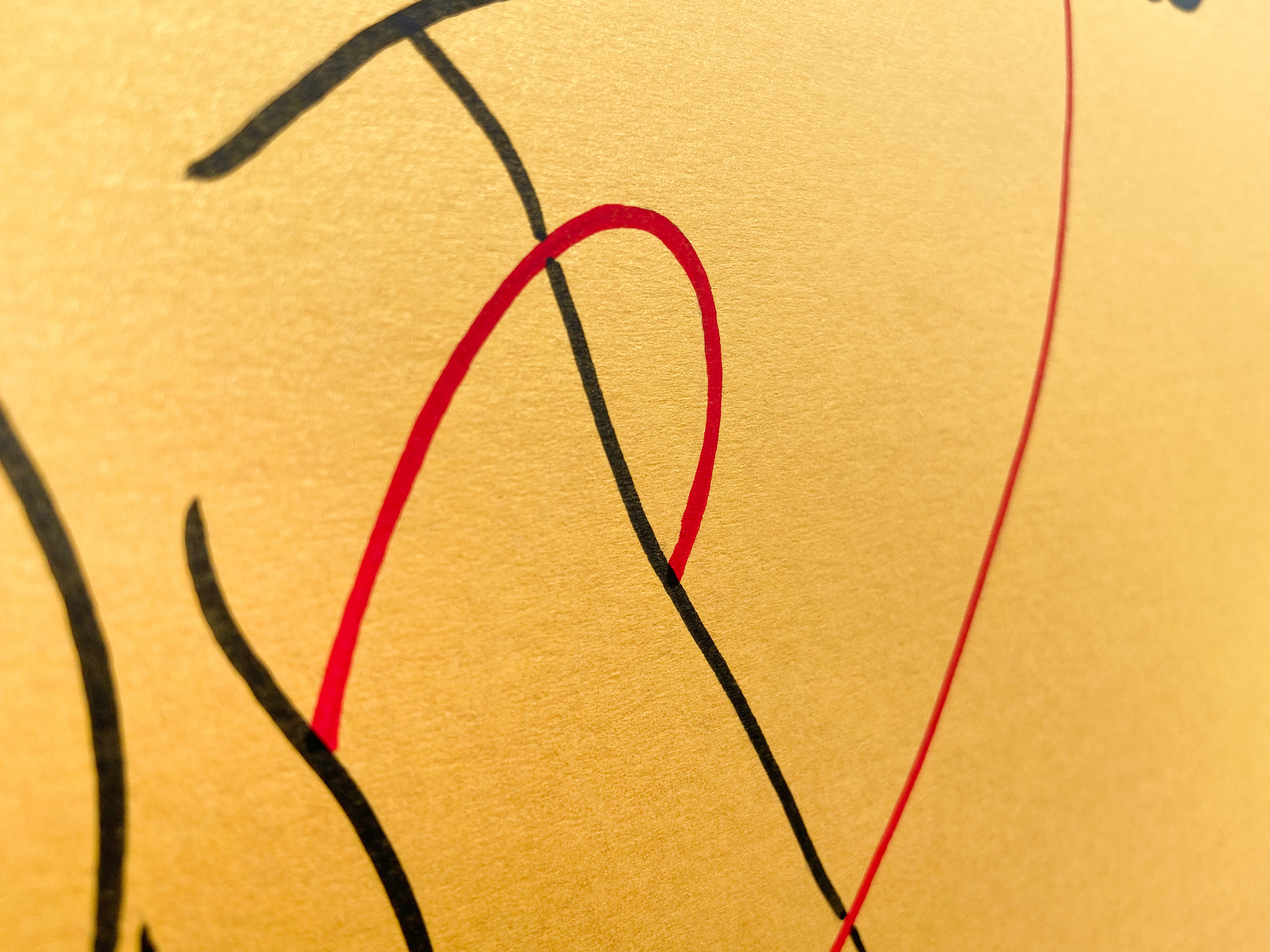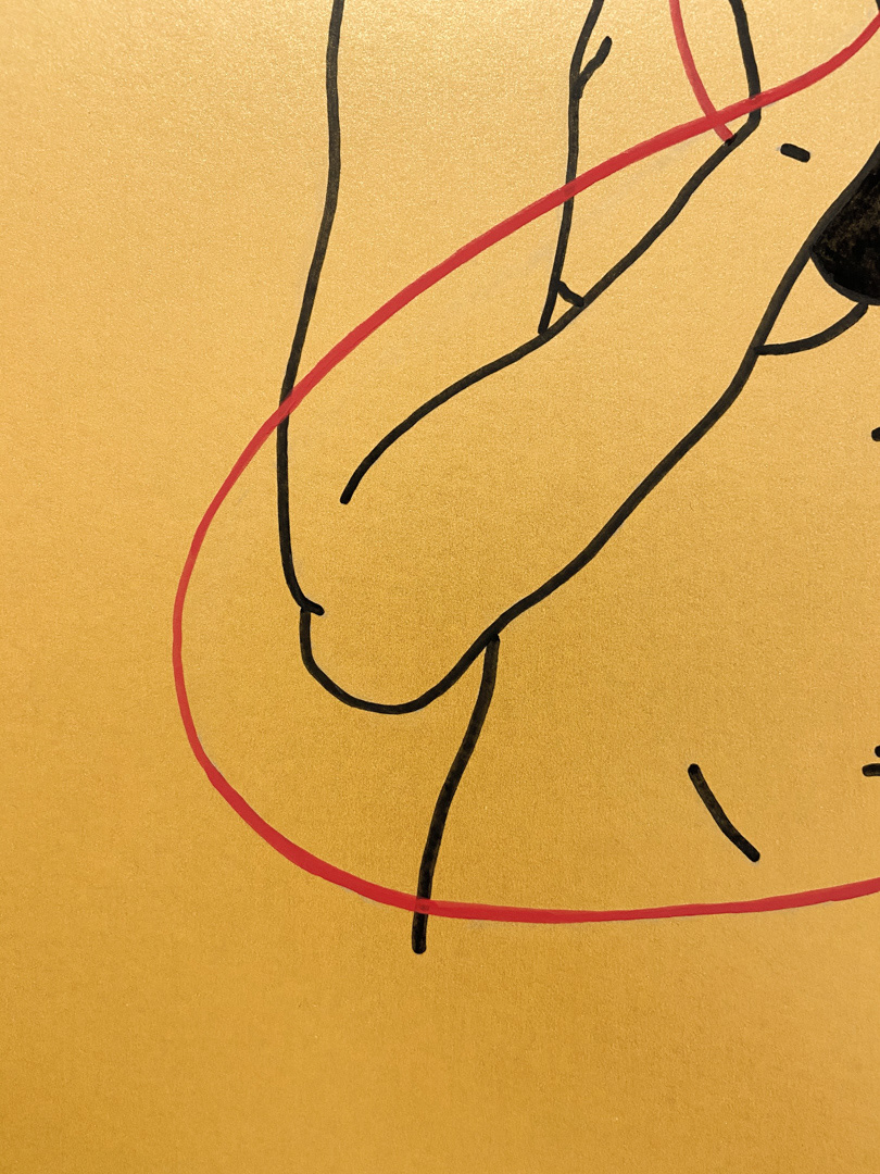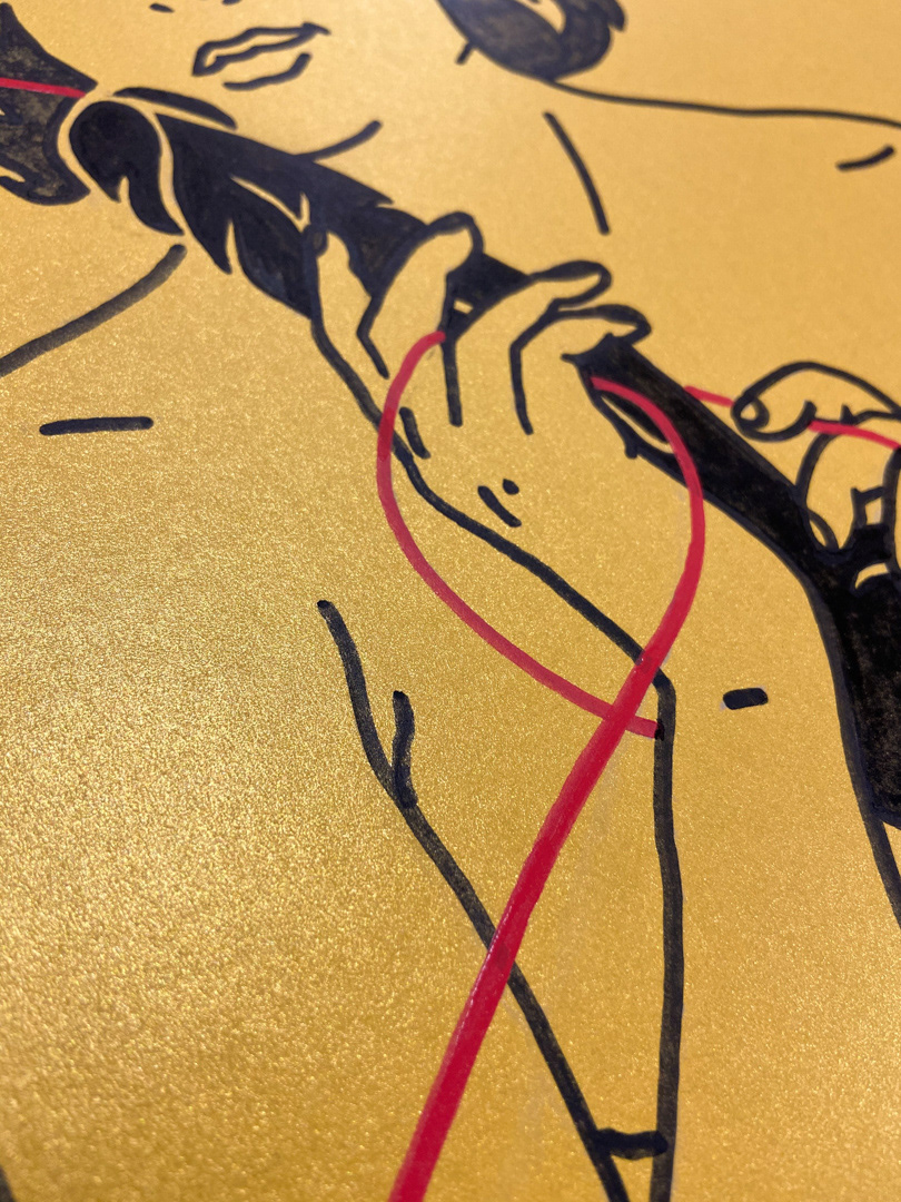 Golden metallic paper, acrylic, matte varnish, 70x50 cm (2021)
