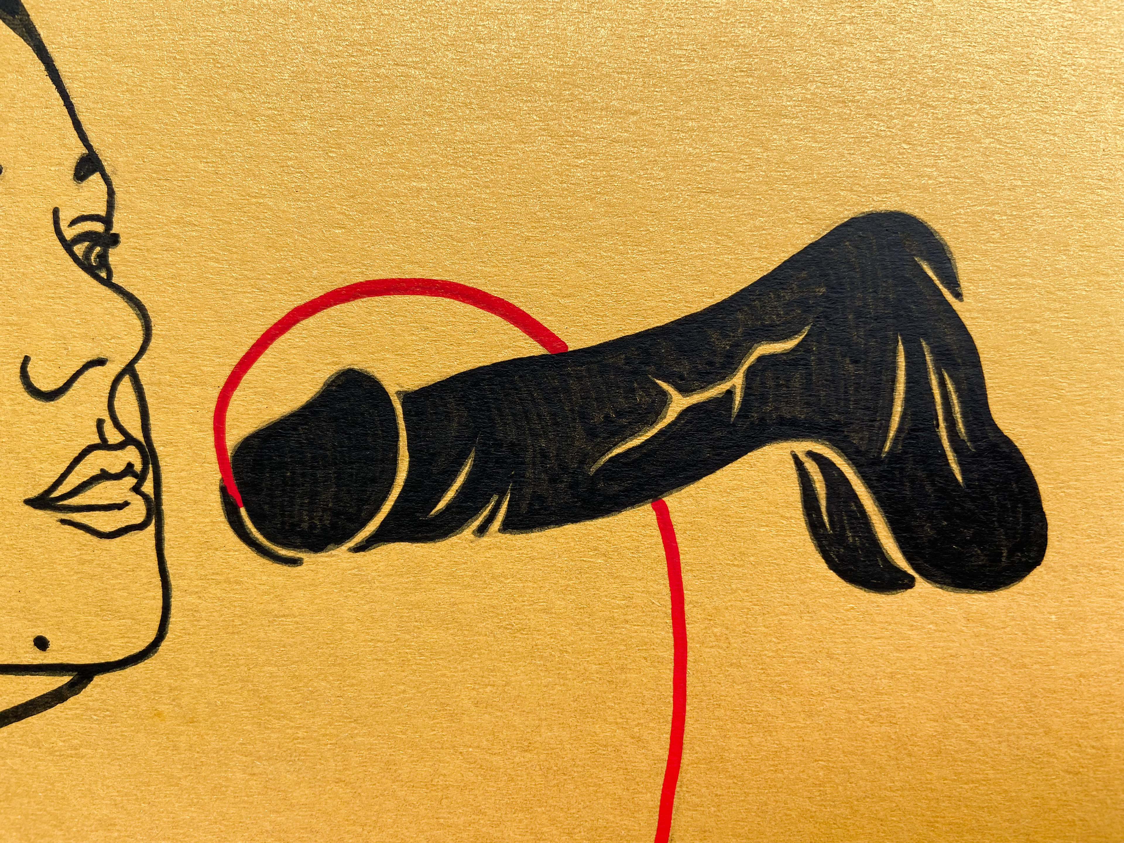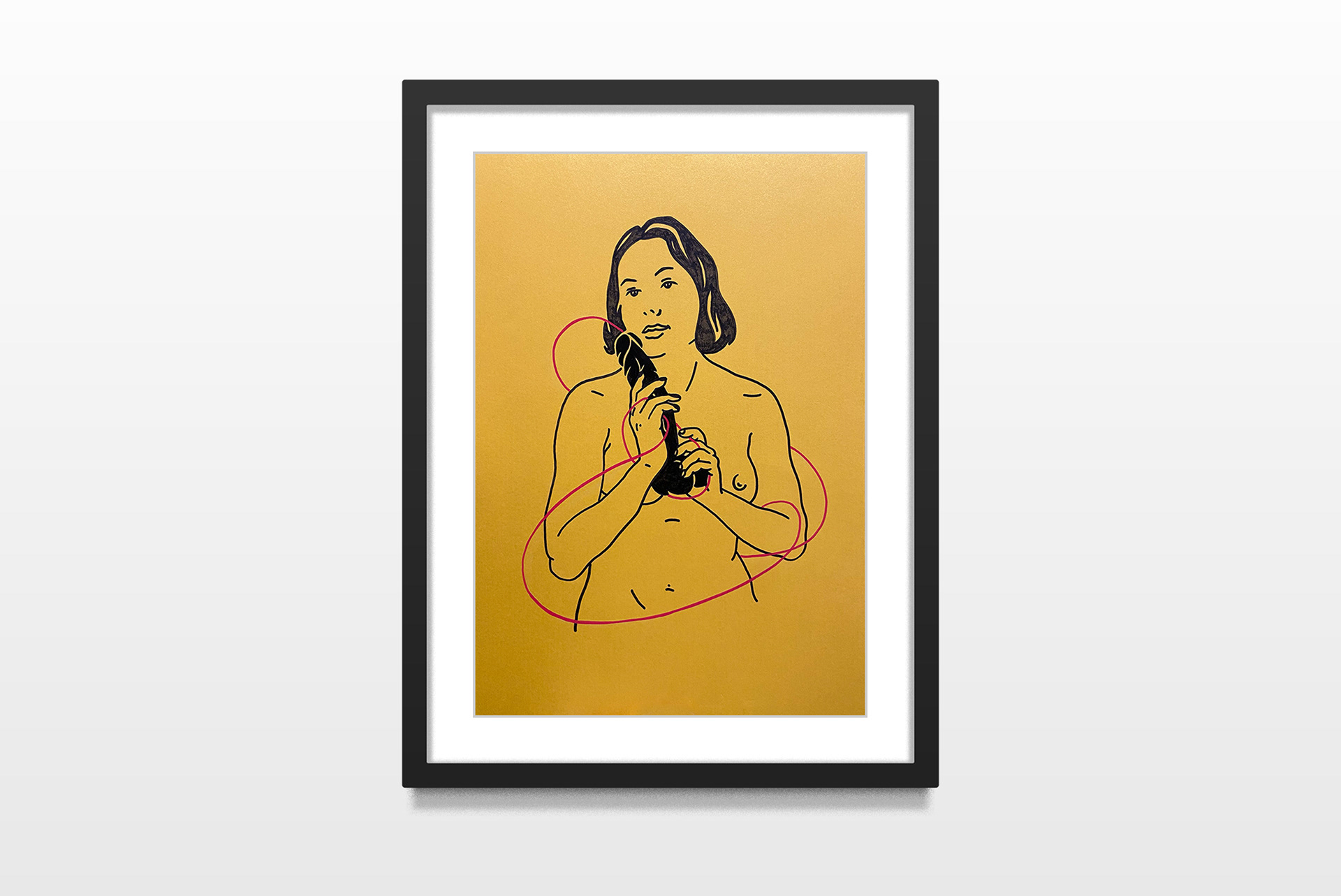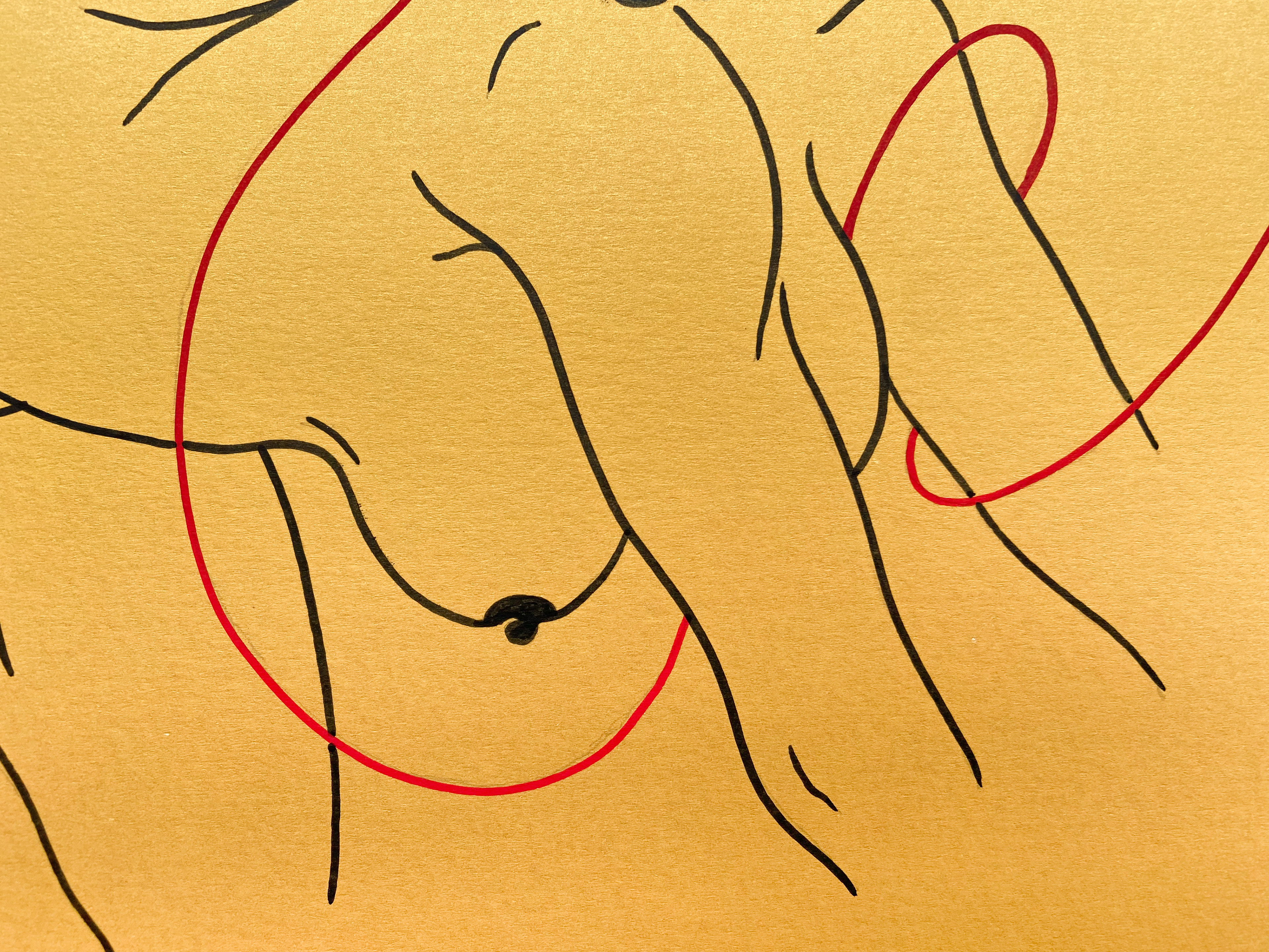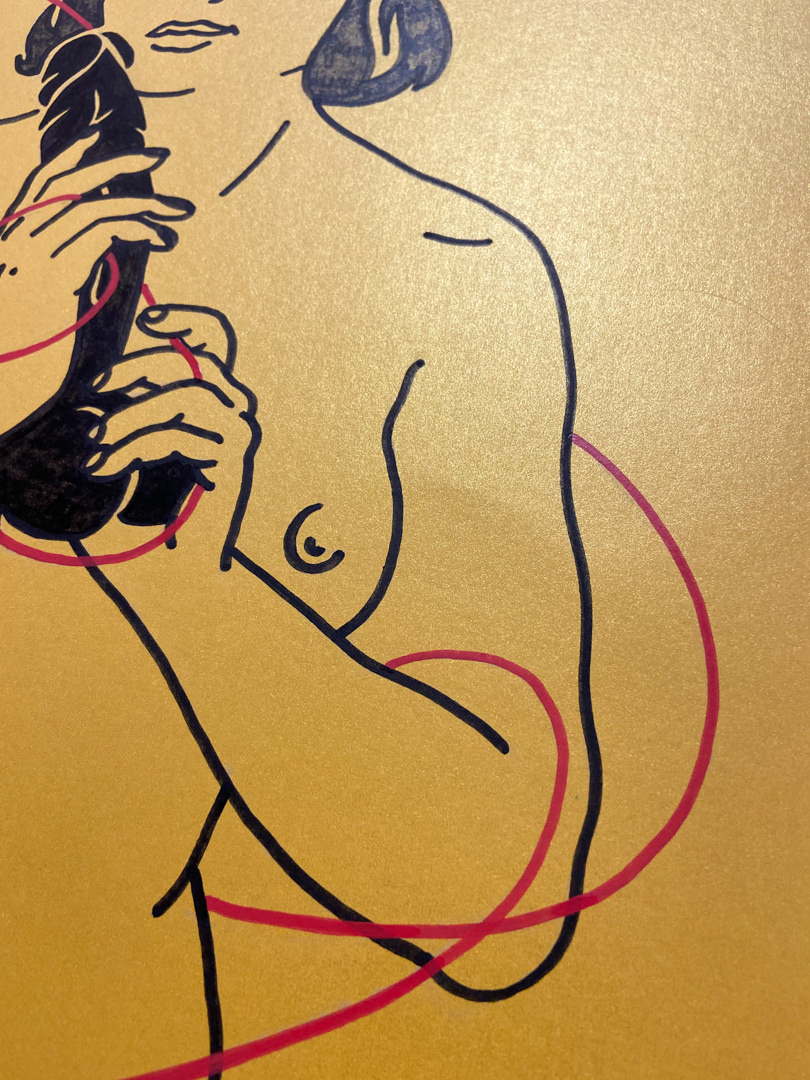 Golden metallic paper, acrylic, matte varnish, 70x50 cm (2021)