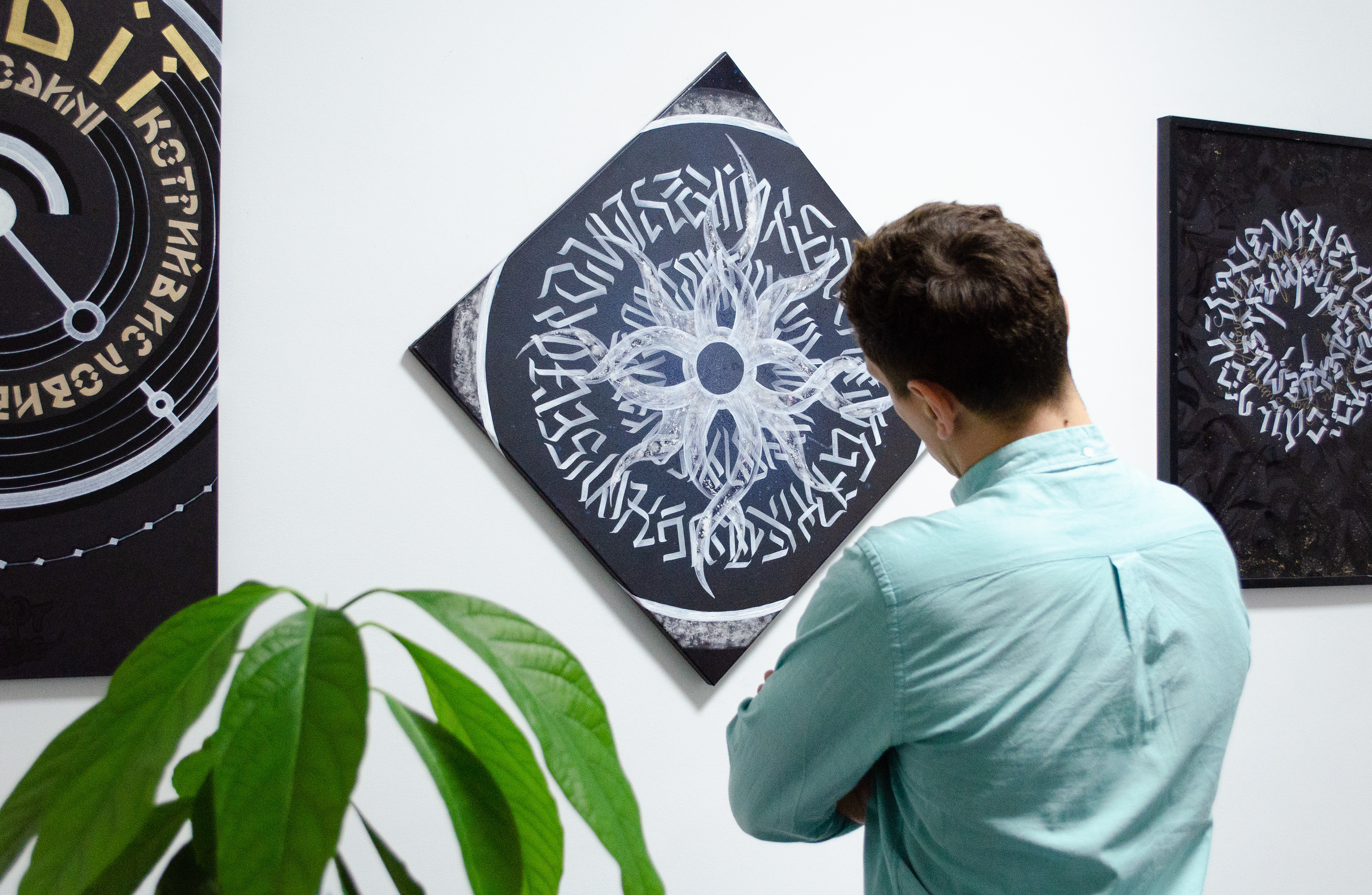 This work consists of circles, inscriptions that whirl and spin with me all of my life, all the words are so deformed that they can hardly be read.